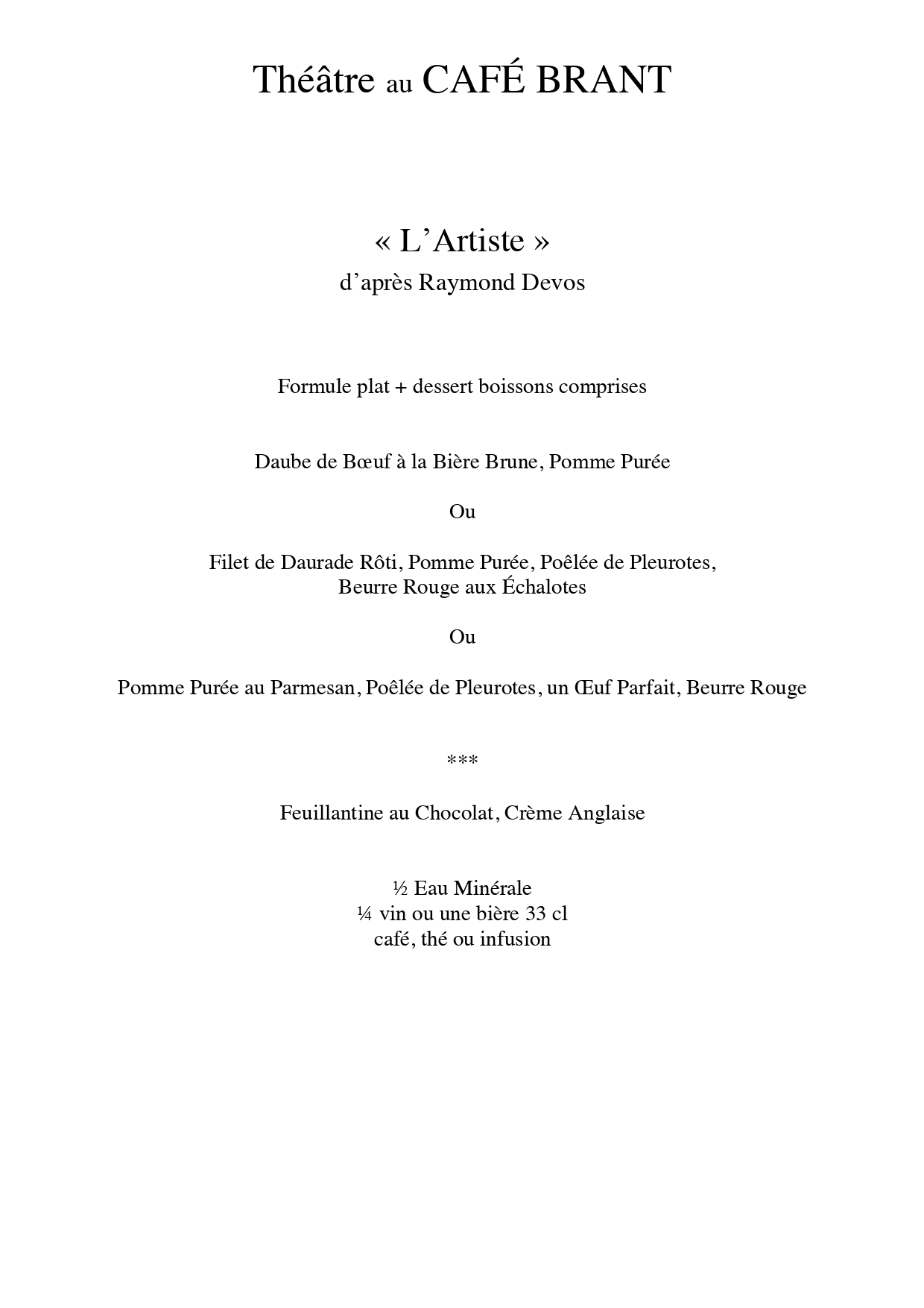 Spectacle + menu (plat à choisir + dessert) boissons comprises (eau, vin, bière, café, thé...) = 46 €
